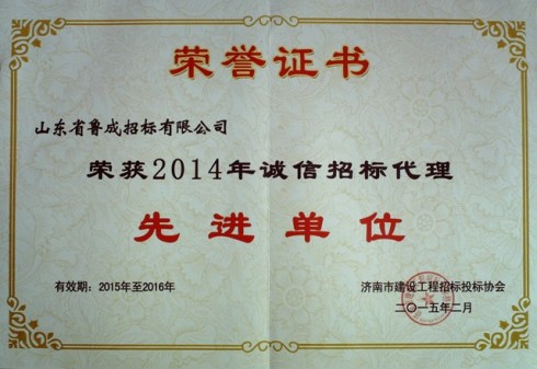 濟南市工程建設項目招標代理機構(gòu)先進單位證書